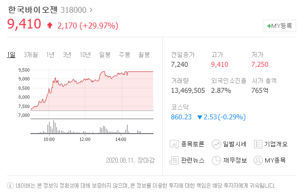 한국바이오젠은 특수 실리콘 제조 기업으로 최근 매출 상승에 대한 기대로 엄청난 거래량이 발생하여 오늘 급등을 보였습니다.