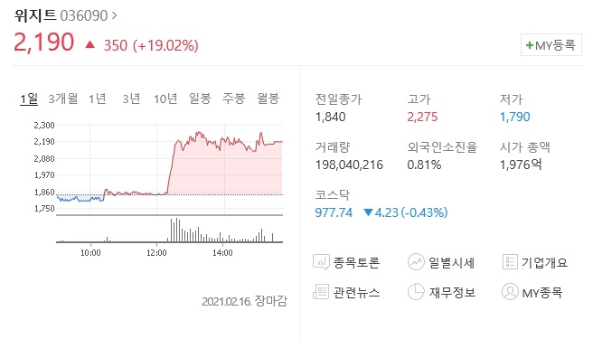 자회사인 티사이언티픽이 빗썸을 운영하고 있는 빗썸코리아 지분 8%를 보유하고 있으며 비트코인 관련주에 편입된 대장주입니다.